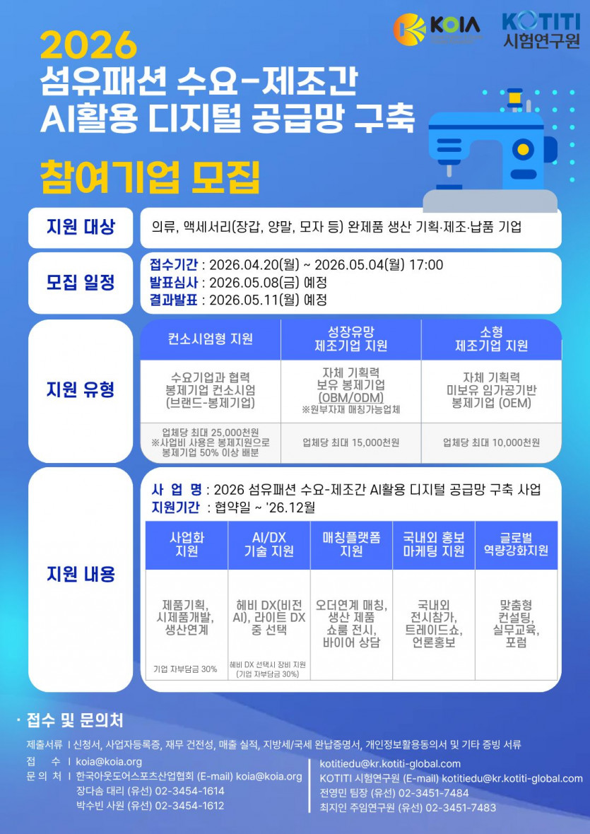 지원대상 : 의류, 액세서리(장갑, 양말, 모자 등) 완제품 생산 기획 제조 납품 기업